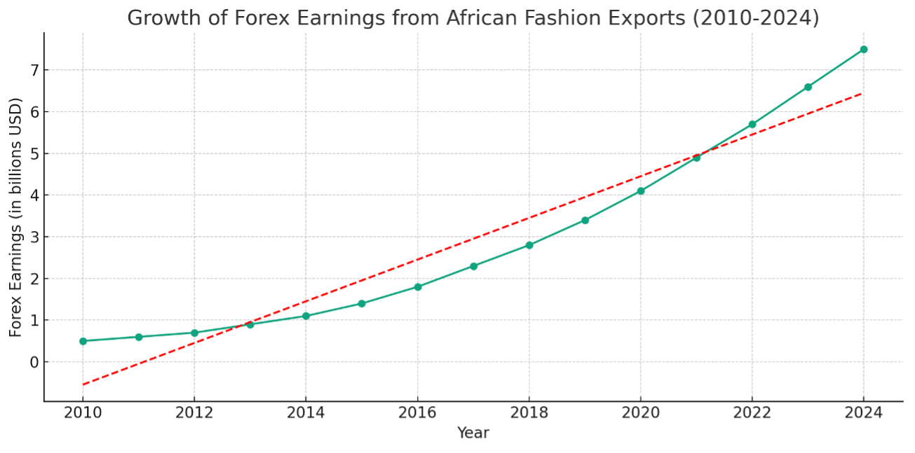 Here's a graph illustrating the fictional growth of Forex earnings from African fashion exports. The trend line suggests a steady increase, reflecting a positive outlook for the industry. Please note that the data used is hypothetical and for illustrative purposes only.